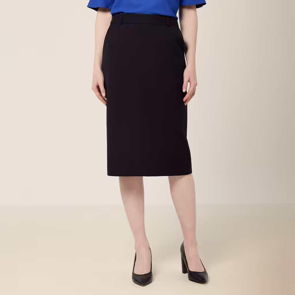 This sleek, slim-fit midi skirt is designed to flatter with its below-the-knee pencil silhouette, offering a timeless and elegant look. The secret stretch waistband ensures a comfortable, flexible fit, while the invisible zip at the centre back maintains a clean, polished finish. The skirt features six belt loops, with a convenient key loop inside the right-hand side pocket, adding both function and style. Two front slant pockets offer a practical touch, while the fully stretch-lined interior provides comfort and ease of movement. A centre back vent allows for added flexibility. With a 4 cm hem allowance, this skirt can be easily tailored for a perfect fit. Additionally, all woven labels are made from recycled polyester sourced from post-consumer plastic bottles, supporting eco-friendly initiatives.